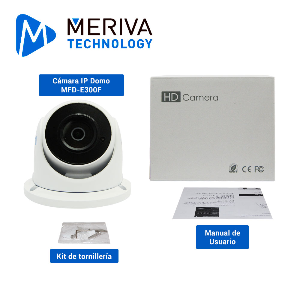 CAM IP DOMO MERIVA TECHNOLOGY MFD-E300F / 2MP / H.265 / 2.8MM / 30M IR / STARLIGHT / FACE DETECTION – CONTROL DE AFORO / MIA INTEGRADO/ P2P / ENTRADA DE AUDIO / MICRÓFONO INTEGRADO / SLOT MICROSD / METÁLICA / IP67 / POE / 12 VCD *PARA RECONOCIMIENTO FACIAL CÁMARA SERIE E300 + NVR SERIE MAIN